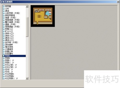 9、 点击左侧地图名称,右侧将显示对应缩略图。选定目标地图后,如示例中的民居A,最后点击右下角确认按钮即可。