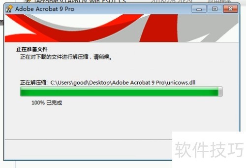 2、 运行Adobe Acrobat 9 Pro安装程序后,软件会自动解压文件,这是Adobe系列产品的常见流程。用户可自定义解压目录,设置完成后点击下一步继续安装。