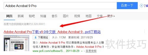 1、 先在百度搜索Adobe Acrobat 9 Pro,操作见图示。