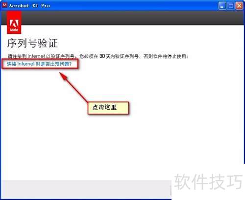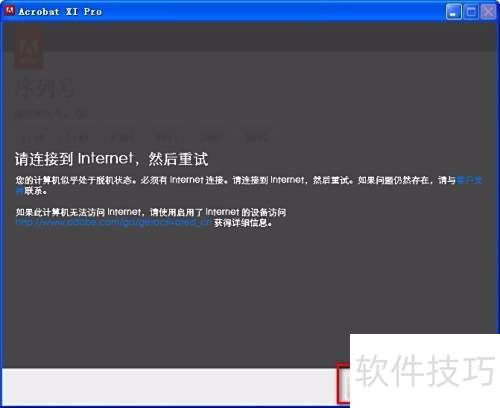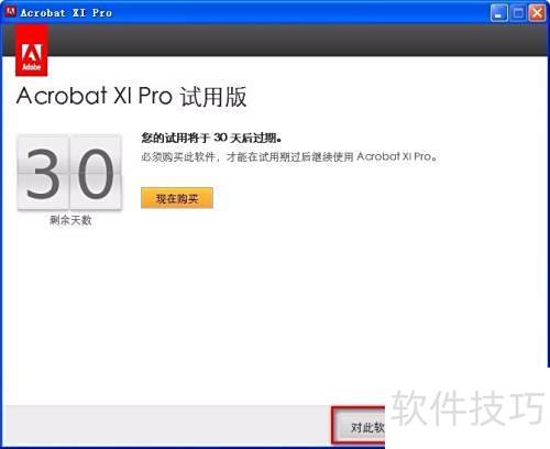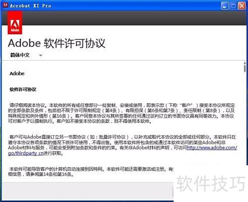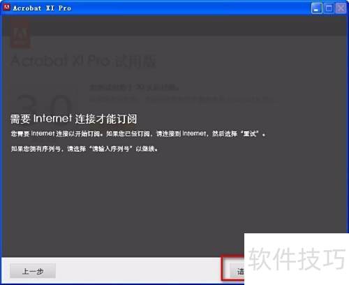 4、 在打开的Adobe许可协议界面中点击接受,随后于Adobe Acrobat XI Pro 30天试用窗口选择授权此软件,并输入提供的序列号即可继续安装。