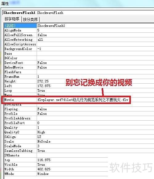 7、 在弹出的对话框中找到movie选项,点击其后的空白区域,然后按下Ctrl+V,将括号内的代码(flvplayer.swf?file=幼儿行为规范系列之不要玩火.flv)粘贴进去。接着,把代码中幼儿行为规范系列之不要玩火.flv替换为你实际要插入的FLV视频文件名。注意,所替换的视频文件必须与当前文件放在同一文件夹内,否则无法正常播放。操作完成后保存设置即可。