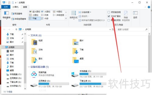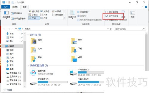 在Windows 10中,打开文件资源管理器,点击查看选项卡,勾选文件扩展名即可显示文件后缀名。