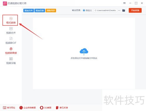 1、 首先启动电脑,运行优速视频处理大师2.0.2.1工具,进入界面后点击左侧的选项,即可开始转换视频格式,该功能支持二十多种常见视频格式,操作简单便捷。