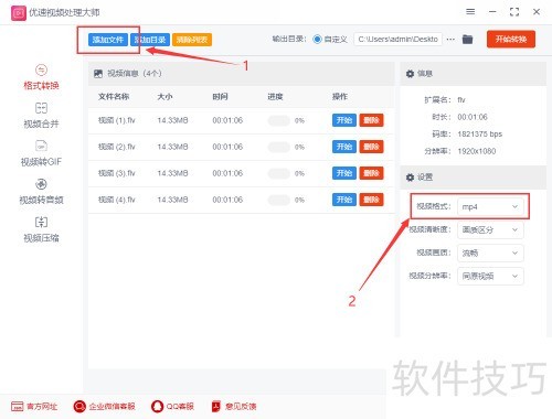 2、 第二步,点击蓝色的按钮,将待转换的FLV视频导入软件,支持多文件批量处理;转换格式默认为MP4,无需额外设置。