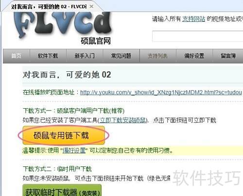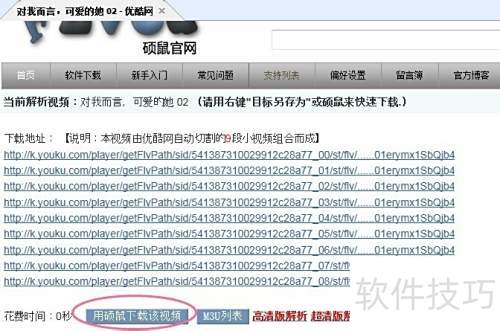 2、 视频解析完毕,点击硕鼠下载分段视频,使用其专用链接自动合并文件。