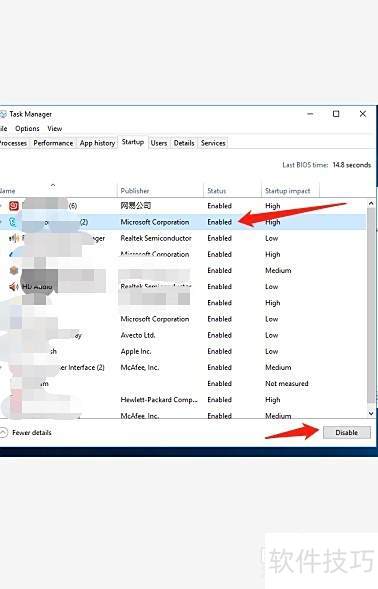 6、 第六步:在启动设置界面中,找到已启用的lync或skype程序,选中后点击右下角的禁用选项,即可阻止该程序开机自动运行,从而加快系统启动速度,提升使用体验。