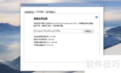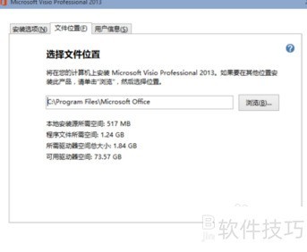 5、 选择自定义后,可浏览并指定文件保存位置,系统会显示所需及可用空间。在桌面创建快捷方式,双击Visio图标即可直接新建文件。