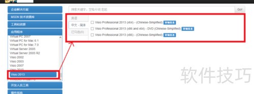 2、 在左侧点击应用程序,找到最新版的Visio 2013,右侧会显示各版本详情,选一个适合自己的版本,点击详细信息获取下载链接,复制后用迅雷即可下载。