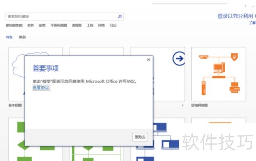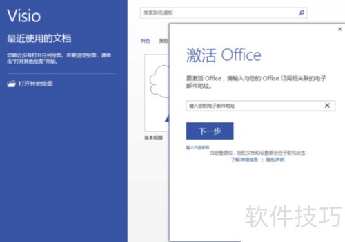 4、 启动Visio时会提示登录Hotmail账户,可选择跳过。随后勾选使用推荐设置,系统将播放Office系列产品介绍视频,可直接忽略。进入主界面后选择空白绘图,此时会发现软件尚未激活,功能受限无法正常使用。