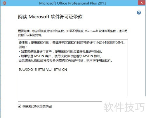 3、 打开Office2013文件夹,双击运行其中的setup.exe文件以启动安装程序。在安装过程中,当出现Microsoft软件许可证条款界面时,请勾选我接受此协议的条款,然后点击继续按钮,即可完成该步骤并继续后续安装流程。