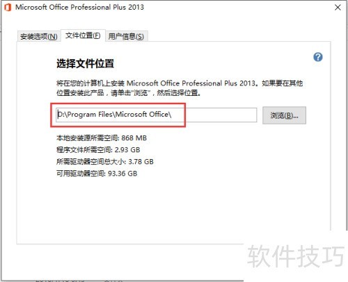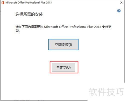 6、 运行setup程序后,会显示Microsoft Office 2013的安装窗口。建议在安装时选择自定义方式,并将文件保存至D盘,以便更好管理磁盘空间,具体操作可参考示意图。