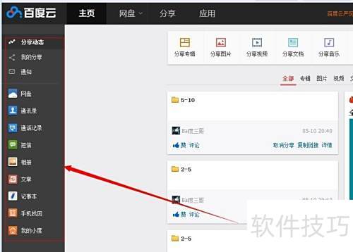 4、 百度云盘主页左侧设有多个功能选项,用户可按需选择,本文以网盘功能为例进行说明。