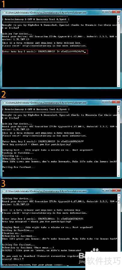 4、 若破解工具运行时闪退,建议先卸载HTC SYNC程序,因可能存在兼容问题。如电脑无法识别手机驱动,可自行安装第三方手机连接工具。随后输入STEP2中获取的序列号并按回车确认,静待程序运行。之后系统会提示是否安装recovery,输入Y并确认即可完成操作。