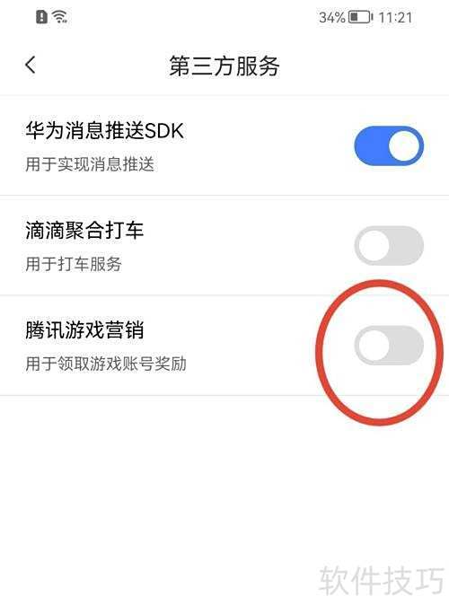 4、 在腾讯游戏营销功能栏中,点击关闭按钮即可停用该服务。