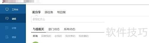 3、 支持发布动态、任务及日报,查看同事最新动态,类似小型团队QQ群。关注成员即可查看其内容,管理员可设置计划可见权限。