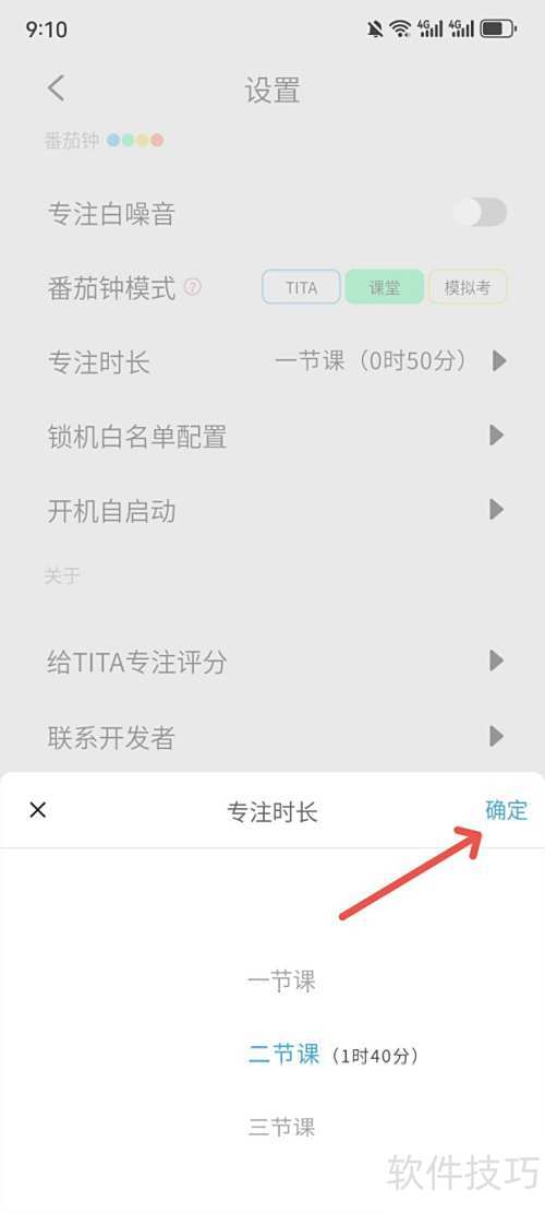 3、 进入专注时长设置,选两节课并确认即可。