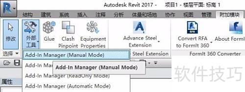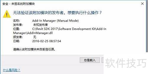 9、 启动Revit时会提示是否载入插件,选择全部或始终载入即可。接着新建一个项目,在附加模块菜单下,首个选项即为外部工具,其中包含Addin Manager。至此,Revit的二次开发环境已成功配置,开发者可在Visual Studio中编写代码,并通过Addin Manager加载运行插件,实现功能扩展与定制开发。整个流程简洁高效,便于后续开发调试。