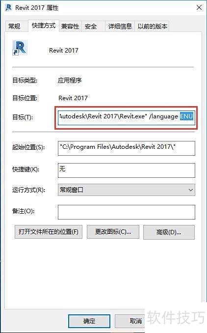 12、 调用API时,若不清楚具体方法名称,可将桌面Revit 2017图标属性中的语言设为ENU,重启后软件变为英文界面,此时菜单或功能的英文名称通常与API命名一致,直接在API文档中搜索该英文关键词即可快速定位对应接口,提升开发效率。