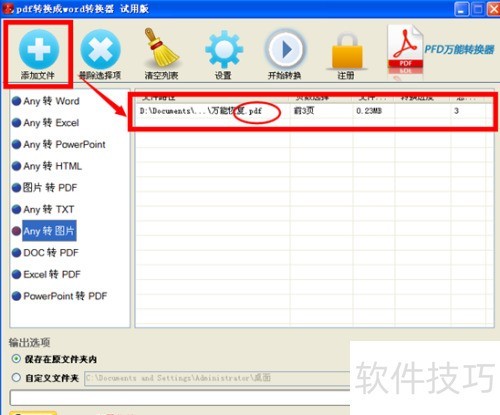 3、 启动软件后,通过添加文件功能将需要转换的PDF文档导入程序。文件添加完成后,设置保存位置,既可使用默认路径(如桌面或电脑指定文件夹),也可自定义存储目录,只需点击浏览按钮选择目标文件夹即可完成设置,操作简单直观,方便快速完成转换任务。