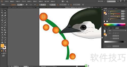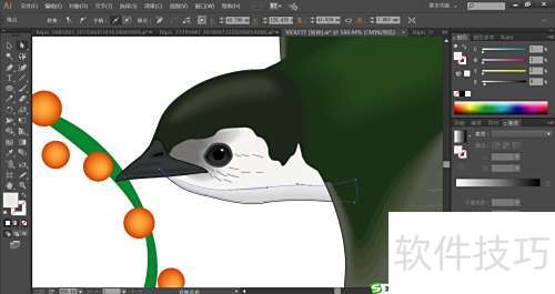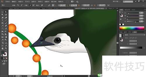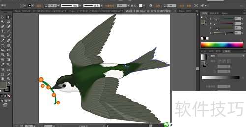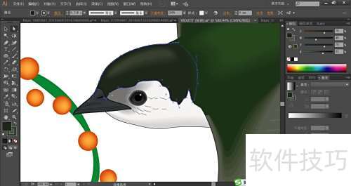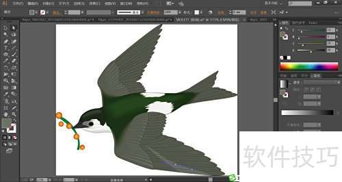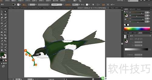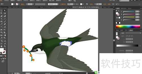 3、 飞燕头部用绿黑渐变填充,尖嘴配以灰与灰黑,鼻孔则填为黑色。