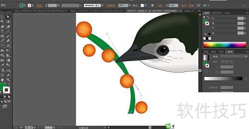 2、 用绿色涂满枝条,橙红色填涂果实,再用网格工具点击果实,使其呈现从橙红到橙黄的自然渐变。