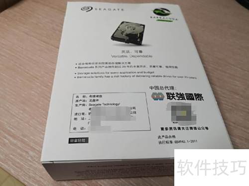 2、 包装盒背面顶部以中英文对照形式展示硬盘的核心优势,并配有产品图片;底部列明厂商详情与联系方式;右侧则标注了希捷中国总代理联强国际的相关信息。