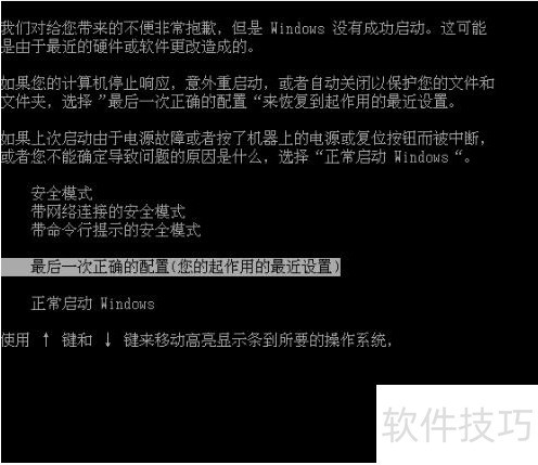 3、 选择最后一次正确的配置启动系统,按下回车键后电脑将自动重启,稍等片刻即可成功进入系统。此方法操作简便,亲测有效。若问题仍未解决,请继续参考后续步骤。