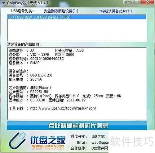 4、 从图中可见,这款金士顿正品U盘采用群联PS2251-50主控方案,搭配英特尔MLC优质闪存颗粒。通过U盘量产网可查到对应量产工具,使用MPALL 3.29版本即可完成量产,操作简便,网站提供详细教程,适合新手快速上手。