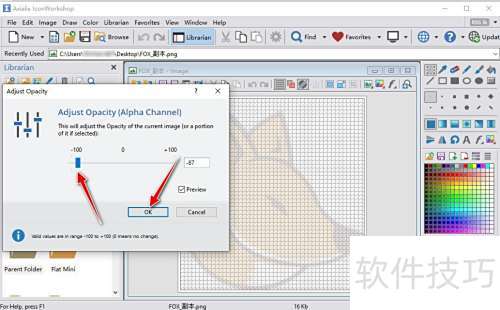 6、 将滑块向左拖动可降低透明度参数至负值,数值越小图标越透明;向右拖动则增加正值,数值越大图标越不透明。调整完毕后点击OK按钮确认应用,即可实时查看图标透明效果的变化。