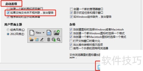 10、 进入常规设置中的启动选项,勾选文档文件未关联时发出警告,最后点击确定以完成配置。