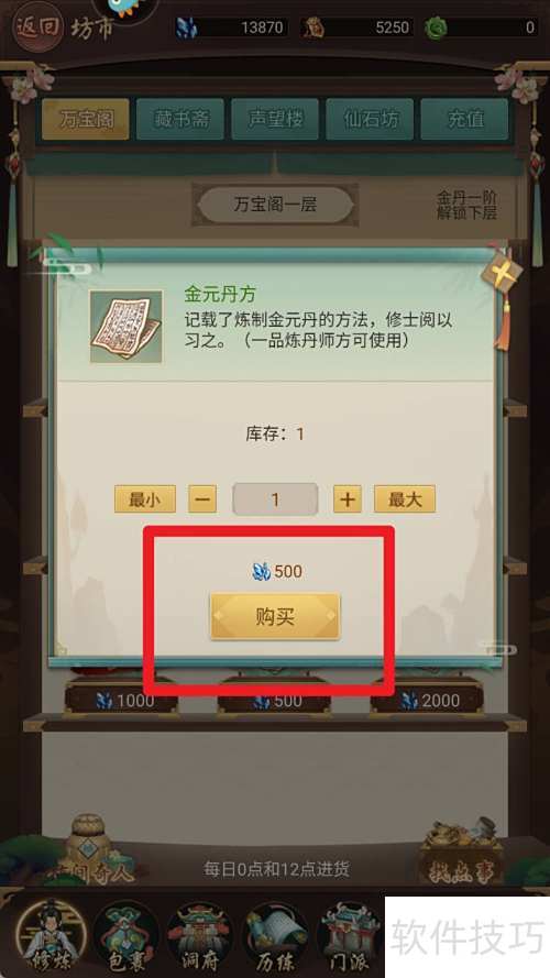 5、 进入万宝阁界面后,选择金元丹方图标即可。