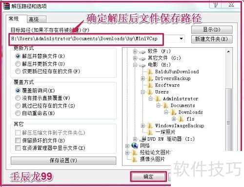 7、 在解压路径和选项窗口中选择保存位置,确认无误后点击确定按钮即可完成设置。