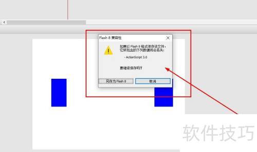 6、 由于当前文档的代码类型为Actionscript3.0,而Flash8仅支持Actionscript2.0,因此会出现所示的提示信息。