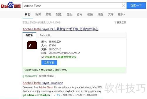 2、 首先访问百度搜索Adobe Flash,找到官网下载最新版本并安装。安装过程中若出现捆绑软件提示,可取消勾选相关选项,避免安装不需要的程序。