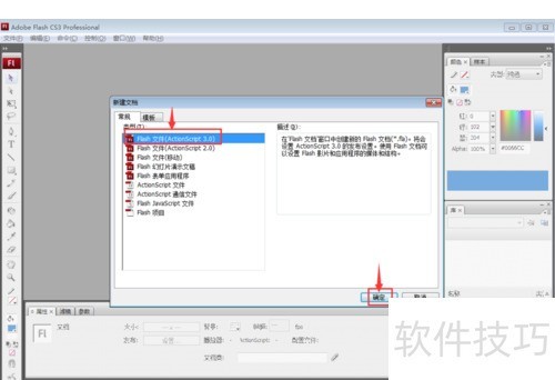 4、 在新建文档界面选择Flash文件(ActionScript 3.0),然后点击确定按钮。