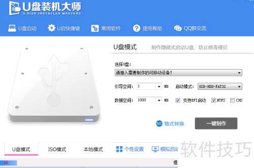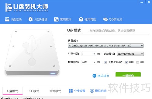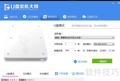2、 打开U盘装机大师软件后,若未显示U盘,可尝试重新插拔U盘或重启软件,稍后即可正常识别,具体效果所示。