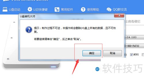 4、 此时会弹出提示框,说明该操作无法撤销,将清除H盘所有数据且无法恢复。若已确认数据备份完毕,可点击确定继续;否则点击取消。所示,我们已做好备份,直接点击确定即可。