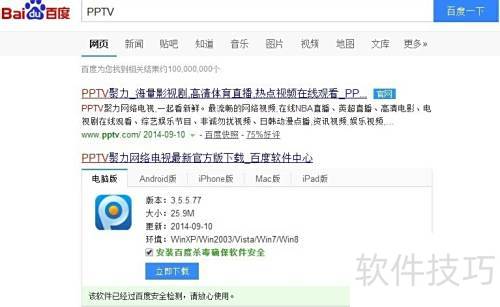 1、 在百度搜索PPTV,找到后点击下载按钮。