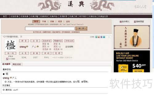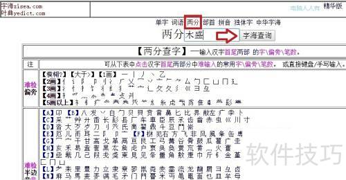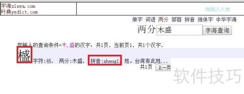 2、 先访问字海或叶典网站,利用两分法查字,输入木和盛组合查询,即可获取该字的读音与详细解释。
