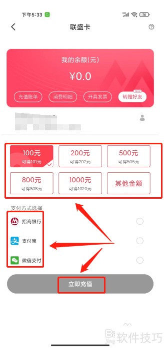 4、 第四步:打开联盛卡,选好充值金额和支付方式,然后点击立即充值即可。