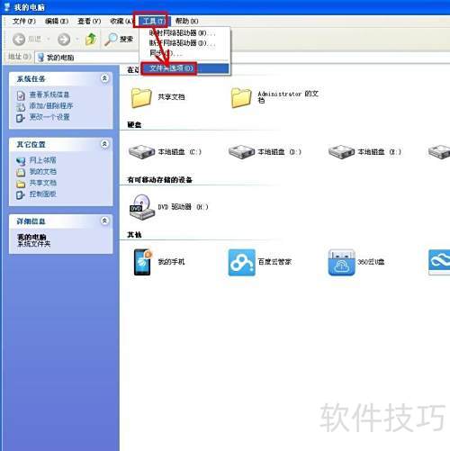 2、 打开我的电脑,点击工具菜单中的文件夹选项。