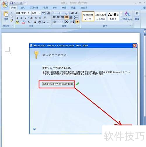 8、 打开Word2007后,界面会提示激活,按图示输入激活码KGFVY-7733B-8WCK9-KTG64-BC7D8,然后点击激活按钮即可完成操作。