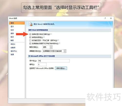 4、 在Word选项中,勾选选择时显示浮动工具栏以启用该功能。