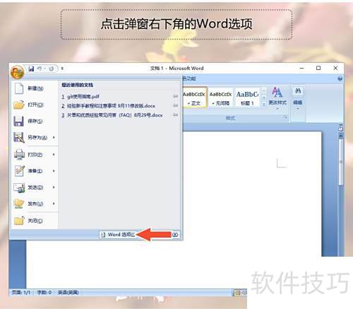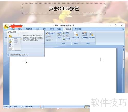 2、 启动Word 2007后,用鼠标点击左上角的Office按钮即可操作。...