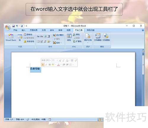 6、 如今在Word中输入文字后选中,便会弹出浮动工具栏。