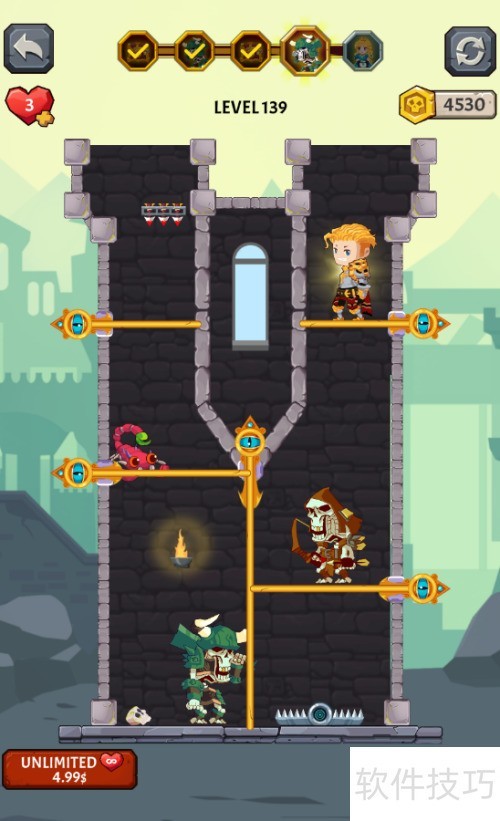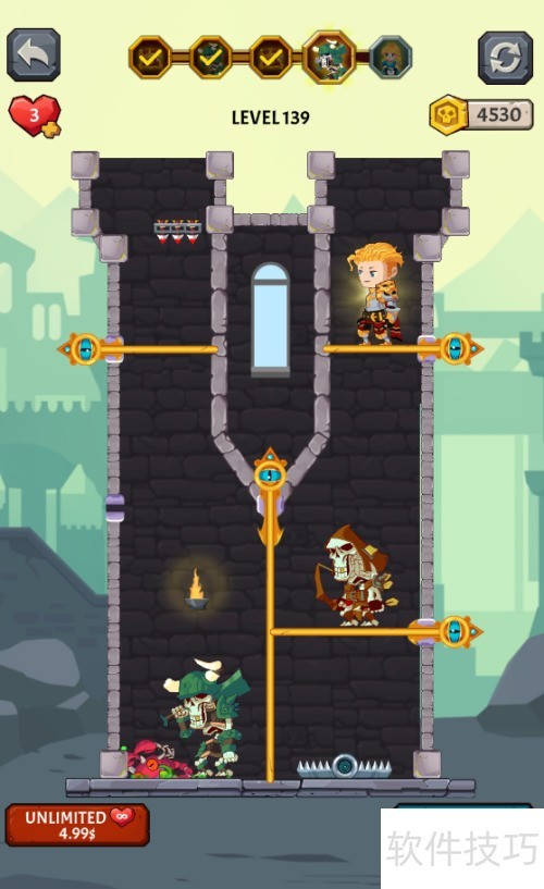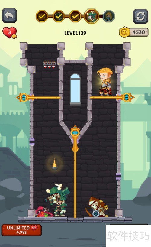 1、 少年位于右上角,暗箭在左上,捕兽夹置于右下,需清除毒蝎和骷髅兵,具体情形见图示。