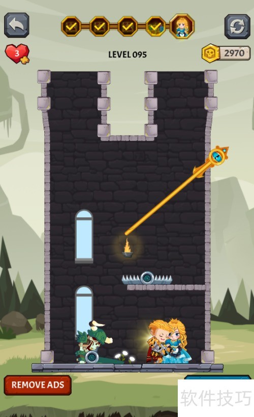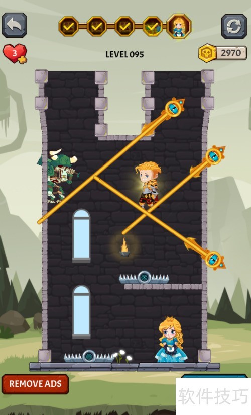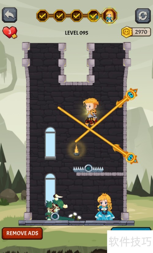 1、 少年立于捕兽夹右侧,骷髅兵在其左,救出女孩便可过关,详情见图示。