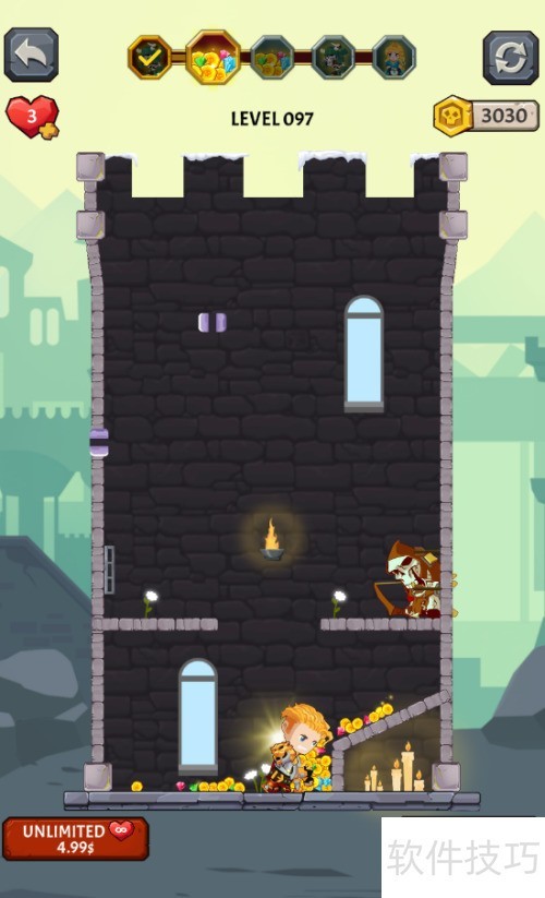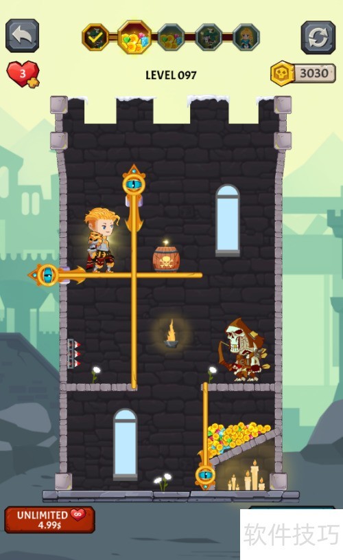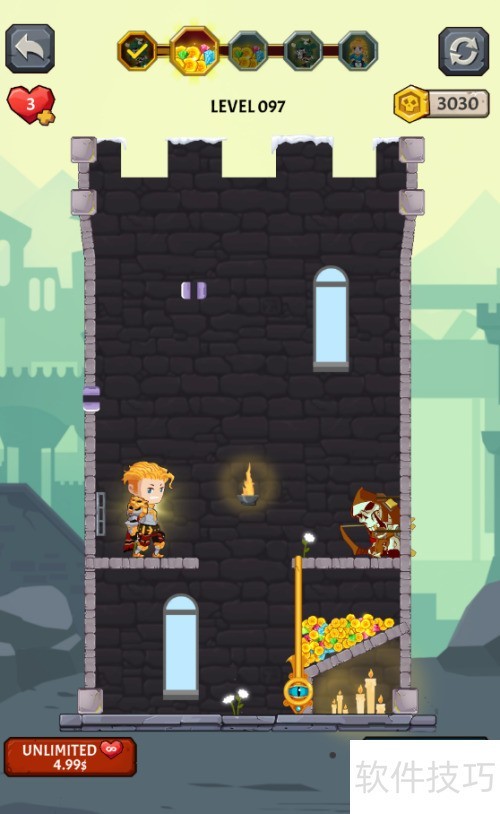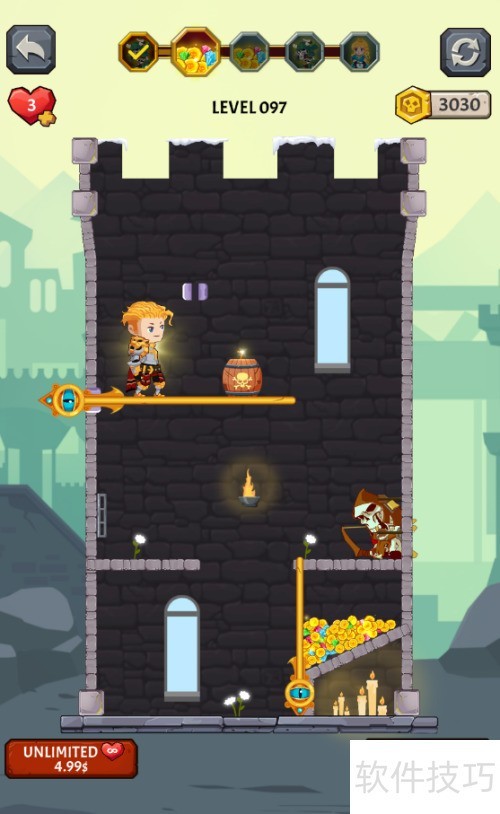 1、 少年侧立暗箭之上,火药桶置于其右,骷髅兵守于宝藏上方,拾取宝藏便可过关。