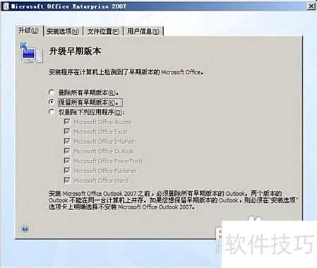 2、 此外,有些用户安装Office 2007只是为了体验新功能,日常办公仍习惯使用Office 2003。这种情况完全可行,因为微软在安装机制上进行了优化,支持在同一系统中并行安装多个版本的Office。只需在安装Office 2007时选择自定义模式,安装程序会自动检测系统中已存在的Office组件,并提供三种升级选项。此时,用户应选择保留所有早期版本,这样就能确保Office 2003不受影响,同时顺利安装Office 2007,实现两个版本共存,满足不同场景下的使用需求。整个过程操作简单,无需额外配置。