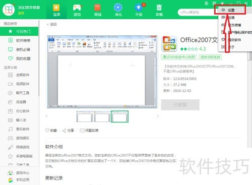 4、 第五步,点击软件管家右上角菜单图标,下拉选项中即可找到设置功能。